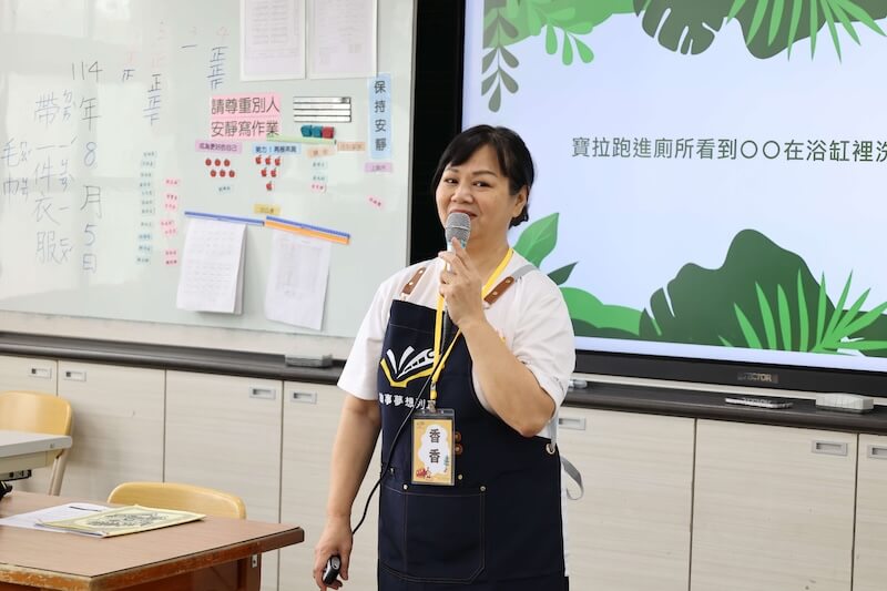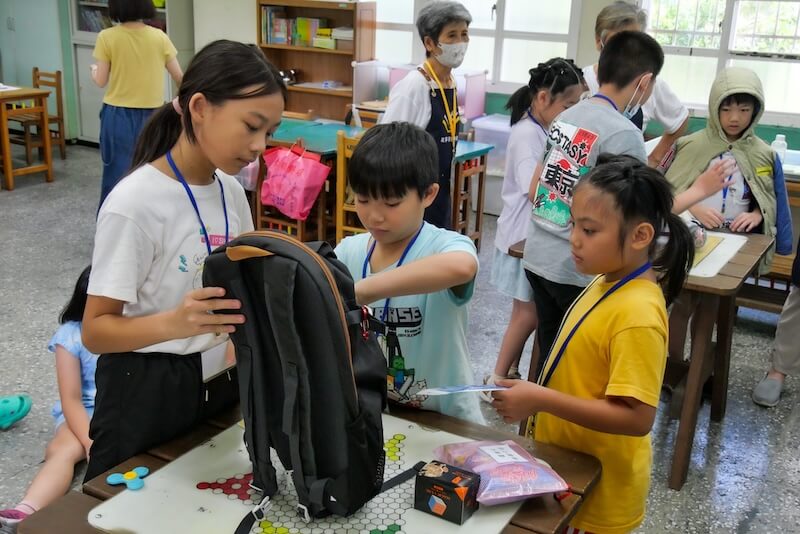 「分類高手」則利用圖卡引導孩子思考如何將物品做有效的區分,並且進行小組競賽以激發孩子的學習欲;還有「書包收納大賽」由各組推派人選上台分享收好的書包、爭取得分;「彩繪資料夾」則可以看出每個孩子的創作風格,利用簽字筆與卡點西德在透明的資料夾上作畫,有人畫了椰子樹、有的是大鯨魚……。