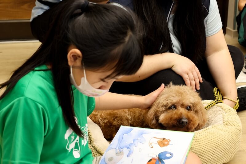 園區收容的浪浪們都受到很妥善的照顧,經過評估安全、穩定的狗狗可以離開隔間直接和孩子們互動,例如表演握手、趴下或讓孩子撫摸。最可愛的環節是「唸書給狗狗聽」,大家都覺得很新鮮、很溫暖,其實就是透過陪伴輔助犬的功能,讓比較沒辦法靜下來讀書的孩子在小動物的陪伴下,有一段時間願意放下其他事情、好好地唸書。看到狗狗溫馴地在身邊「聆聽」,感覺孩子們唸起書來真的好投入!
